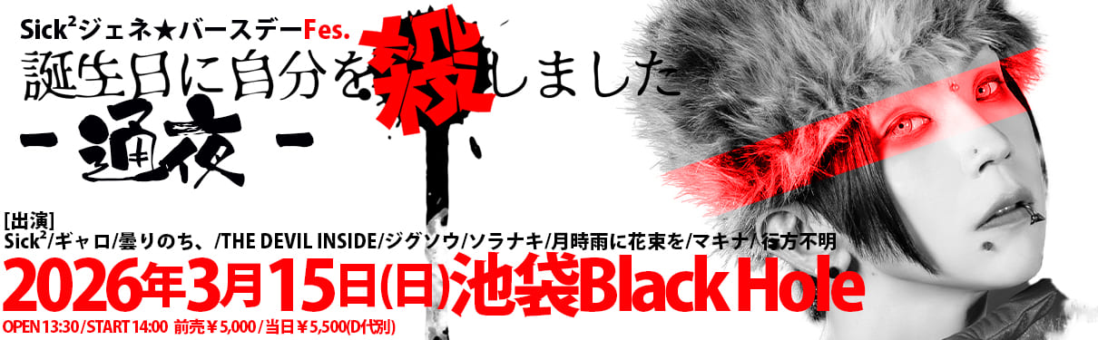 Sick²ジェネ★バースデーワンマン『誕生日に自分を殺しました。~本葬~』2026年3月16日(月) 池袋Black HoleOPEN 17:30 / START 18:00前売¥4,000 / 当日¥4,500(ドリンク代別) [チケット]e+先行受付:1/15(木)...続き