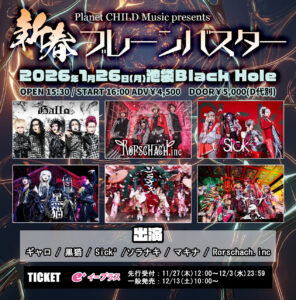 2026年1月26日池袋BlackHole Planet HILD Music presents「新春ブレーンバスター」公演に出演予定だったグランギニョル様ですが、バンド解散に伴い、出演はキャンセルとなりました。